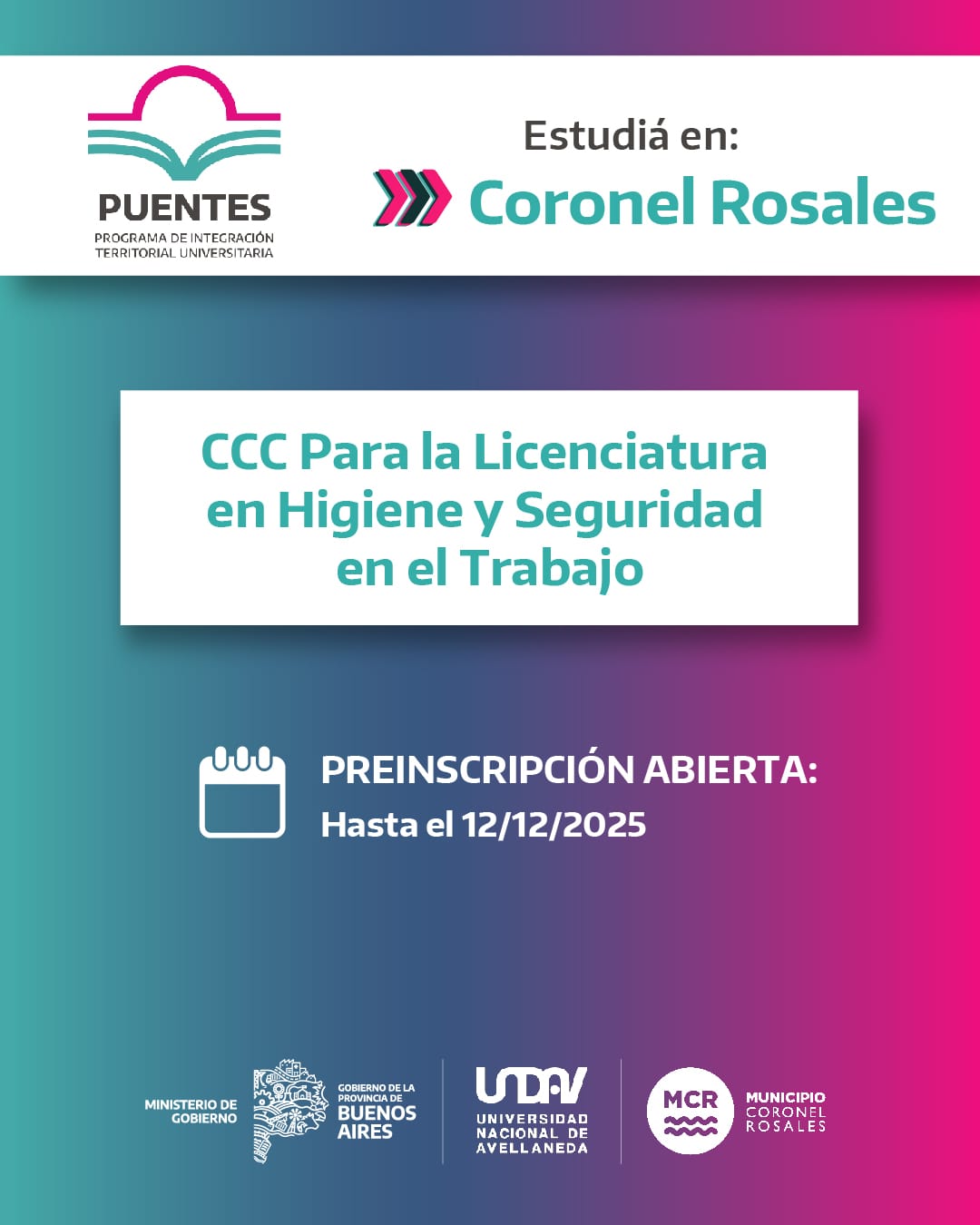 Educación Se encuentra abierta la preinscripción para la Licenciatura en Seguridad e Higiene en Coronel Rosales Ver más » 04/12/2025